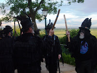 Most people think of ribbons and bells and maypoles when they think of Morris Dancing. This may be the form known as Cotswold Morris, although I'm not sure about the bells. The sort I'm into is Border Morris, which is really boisterous and involves enthusiastic use of sticks and where the dancers tend to dance in black costumes decorated with tatters (rags) and/or feathers and black their faces.